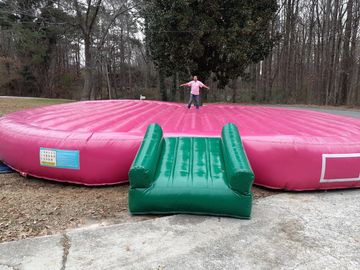 LOTS of jumping fun here. Our Big Pink Pillow is so much fun! Kids (and adults) will be happy and entertained on this inflatable jumping pad.