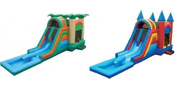 Our Bounce & Double Dip is available in two themes (Tropical or Castle). Both can be used wet or dry.
